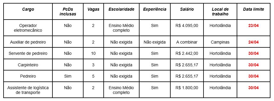 Você tem experiência profissional na área de construção civil? Então, fique atento! O PAT (Posto de Atendimento ao Trabalhador) de Hortolândia, órgão da Prefeitura, está com 24 vagas de emprego. Dessas, 10 são para servente de pedreiro. Há ainda cinco vagas para pedreiro, para as quais PcDs (pessoas com deficiência) também podem concorrer.